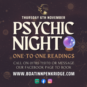 Psychic Night – One-to-one Readings 🔮 Psychic Night at The Boat Inn, Penkridge 🔮 Join us on Thursday 6th November for an evening of spiritual insight and connection! 06 Nov 7:30 pm - 10:00 pm The Boat Inn PenkridgeCannock Road, Penkridge, ST19 5DT